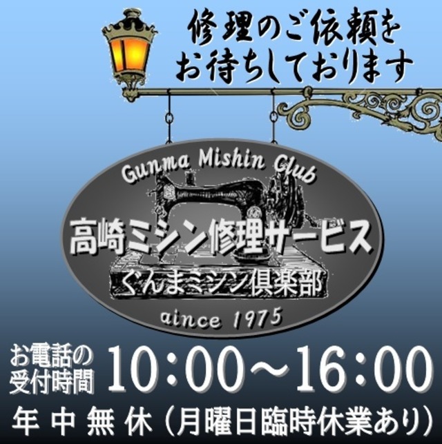 _/_/_/_/_/_/_/_/_/_/_/_/_/_/_/ 【 よ く あ る ご 質 問 で す 】 Q: ミシンの持ち込み修理はできますか? ------------------------------------------ A: ミシン持ち込み修理は終了となりました。 注)事務所への持ち込みは修理スタッフが 出張修理のため不在で対応ができません Q: ヤフオクやメルカリの修理はできますか? ------------------------------------------ A: 勿論可能ですが、こちらでお求めのミシン は安価なジャンク品が大変多く基板故障や 分解修理で部品代が高額な場合もあります。 注)ジャンク品とは通電確認のみで動作未確認 Q: 修理できない家庭用ミシンはありますか? ------------------------------------------ A: 中国製/台湾製/ベトナム製/タイ製など 一部お取り扱いできないミシンがあります。 注)交換部品が廃番の場合は不可能となります 糸立て棒・針板・ペタル販売はありません Q: 家庭用ミシンの販売は行っていますか? ------------------------------------------ A: 修理専門店ですので取り扱いはありません。 注)ご要望は修理スタッフにご相談ください Q: 工業用( 業務用 )の修理はできますか? ------------------------------------------ A: 弊社は家庭用と職業用専門の修理工房です。 Q: ホームページから申し込みができますか? ------------------------------------------ A: 故障の症状で修理が可能かどうかをお聞き するためと修理料金をお伝えできますので お電話でのお申し込みでお願いいたします。 注)すでにお申し込みの方はお電話で願います Q: 修理箇所の保証はありますか? ------------------------------------------ A: 修理完了後は無償保証30日間となります。 以降の修理に対しては有償扱いとなります。 注)修理後は必ず試し縫い確認をお願いします Q: 出張修理の訪問予定日なのにまだ来ない? ------------------------------------------ A: ご訪問時間のご連絡で度々のお電話連絡に お出にならない場合は訪問の順番が組めず ご不在とみなしますので、ご容赦ください。 注)着信拒否設定のお客様はお知らせください _/_/_/_/_/_/_/_/_/_/_/_/_/_/_/ ┏★☆★☆━━━━━━━━━━━━━━━┓ 修 理 の お 申 込 み は お 電 話 で 承 り ま す ┗━━━━━━━━━━━━━━━☆★☆★┛ あなたのミシンの修理屋さん 高 崎 ミ シ ン 修 理 サ ー ビ ス 群 馬 県 高 崎 市 本 町 48 【 ミ シ ン 修 理 の お 申 し 込 み は 】 ☎ 0 1 2 0 - 4 1 - 3 4 8 0 ------------------------------------------ 受付時間 / 10時00分 ~ 16時00分 休業日 / 年中無休 ( 月曜日臨時休業あり ) _/_/_/_/_/_/_/_/_/_/_/_/_/_/_/ .